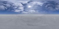An endless salt flat landscape stretches under a sunny sky. Visible clouds add texture to the open space, creating a quintessential desert day scene with salt lakes glistening under the sun.