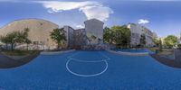 a photograph with a 360 - ball in it of basketball court and city buildings around