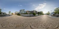 A snapshot of a vibrant Berlin street with cobblestone blocks and a mix of modern and historic architecture. The clear sky reflects off the surface of the road, adding to the charm of this European metropolis.