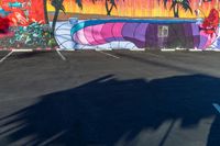 A vibrant graffiti wall in the art district of Los Angeles, California. The urban landscape showcases street art and the city's vibrant energy. Hard shadows create depth and contrast on the one-quarter surface of the wall.