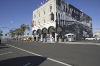 A vibrant and lively street scene in downtown Venice Beach. Classic architecture blends with colorful graffiti walls. Restaurants, cafes, and bars invite tourists to eat out in this bustling mixed-use neighborhood.