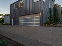 This image showcases a modern residential building in California, USA. The house features a sleek and stylish architecture with a composite material facade and wooden elements. It is located in a peaceful residential area surrounded by lush vegetation. The clear sky above adds to the beauty of the property at dawn. The concrete street and driveway provide easy access to the villa. The entryway and door are well-designed fixtures. This photograph captures the essence of real estate in California, with its modern architecture and serene surroundings.