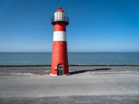 This is an image of a lighthouse located in Holland, Netherlands. The red and white lighthouse stands near the ocean, with a clear sky and open space surrounding it. The lighthouse is situated next to a parking lot and is a prominent feature in the coastal landscape. The image captures the tranquil beauty of the coastline and the harmony between nature and man-made structures. With its fluid design and stunning horizon view, this lighthouse is a must-visit landmark in Europe.