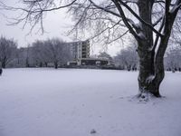 This is an image of a frozen landscape with water, vegetation, and buildings. The trees and twigs are covered in frost, glistening in the sunlight. The freezing conditions have transformed the scene into a winter wonderland. The trees and buildings provide a picturesque backdrop to the frozen landscape. This photo captures the beauty and serenity of winter.
