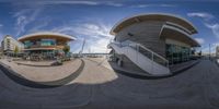 A high-rise architectural building with a fish-eye lens effect, located on the waterfront. Stairs and stairs lead to a recreational area. The coastal landscape and ocean horizon provide a stunning backdrop.
