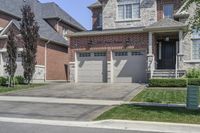 A well-maintained driveway in Toronto, Canada, lined with stone pavers. The clear sky highlights the facade of a suburban home. The brick wall and siding add character to the residential property.