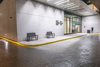 a few benches are sitting on the curb outside a building at night time outside, a city sidewalk, and a large door