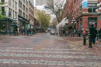 A view of a wet cobblestone road in Vancouver, Canada. Classic architecture lines the streets, while grey skies and rain create an urban atmosphere. Pedestrians cross the road and shop storefronts provide a lively city scene.