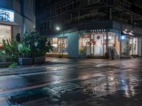 This stock photo shows a wet street outside of an office building in Taipei City, Taiwan. The rain is running down the road, creating reflective surfaces on the asphalt. The neon lights from the surrounding shops and storefronts illuminate the dark cityscape, adding to the urban and lively atmosphere of the city. The artificial light from street lights further enhances the urban design of the area. It is a representation of city life in Taipei, showcasing the vibrant and bustling streets during the night.