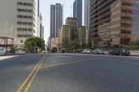 This stock photo shows a wide city street located in Los Angeles, California, USA. The street is surrounded by tall buildings and trees, with traffic passing on the road. It is a bright day with a clear sky, creating hard shadows. The neighborhood is a residential area in this metropolitan area, with a beautiful cityscape and skyline in the downtown area. The straight road provides a clear view of the asphalt, lanes, and infrastructure. Various modes of transport, including automobiles, are visible on this busy urban street.