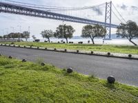 Wide road in Lisbon, Portugal, leading to a bridge. Grass on the side adds a touch of green to the coastal scenery. Sunny skies and a calm harbor create a serene atmosphere.