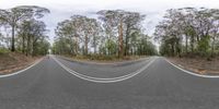 A wide suburban road lined with trees and grass. The straight path of the road leads to a distant residential area. Clouds hover above the landscape, adding depth to the scene.