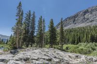 A stunning landscape of a mountain range with clear skies and an open space. The rocky cliffs create a wild and rugged wilderness. A path winds through the forest, leading to the rocky walls.