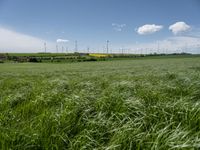 This stock photo features a scenic landscape in Germany. In the image, you can see a field filled with lush green grass and many wind turbines. The clear blue sky with fluffy white clouds adds to the beauty of the scene. The wind turbines represent the importance of renewable energy and the agricultural landscape. It is a perfect representation of open spaces and nature in Germany.