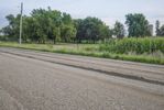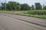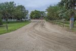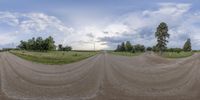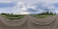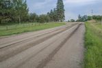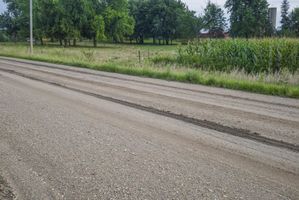 A winding dirt road in Bancroft, Iowa. The road curves through a rural landscape with fields and pastures. A man in a white helmet is seen jumping on the road. Grey sky adds to the atmosphere.