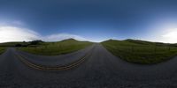 A winding road in California, USA, surrounded by grassy hills. The fisheye image, taken with a 360 lens, captures the open space and natural beauty of the landscape. The clear sky and lush vegetation create a serene and picturesque scene.