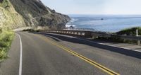 This captivating stock photo showcases a winding road in California, USA. The asphalt road stretches alongside the stunning coastal landscape, hugging the deep blue ocean. Yellow lines guide the way on this scenic highway surrounded by majestic mountains and rocky cliffs. The clear sky adds to the beauty of the natural terrain. The road is well-maintained with guard rails and Armco barriers, ensuring safety for travelers. This image captures the essence of California's iconic Pacific Coast Highway, offering a picturesque view of nature and infrastructure.