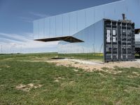 This landscape photo showcases a sculpture in a green grass field in Germany, Europe. The sculpture stands in the center of the frame, surrounded by lush grass and a clear blue sky. Above the sculpture, a glass structure is suspended, adding a modern architectural element to the scene. Two mirrors are placed on the ground, reflecting the artwork and creating an illusion of infinite space. This image captures the blend of nature, art, and modern architecture in the rural European countryside.