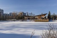 This is an image of a residential home in Ontario, surrounded by open spaces and vegetation. The house features traditional architecture and is situated in a rural area. The landscape is covered in snow, reflecting the freezing temperatures of winter. The clear sky above contrasts with the clouds, creating a serene and peaceful atmosphere. The surface is coated in ice, adding to the winter wonderland feel. This photo captures the beauty of suburban Ontario during the winter season.