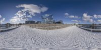 a fisheye lens is shown in the snow on the beach near a bridge,