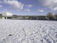 A freezing winter day in the city. Snow-covered plain with buildings lining the horizon. Water fountains adorn the large field, surrounded by trees. Clouds float above the landscape.