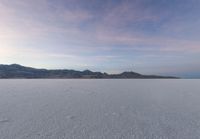 the snow is moving over the ground in the middle of the desert with mountain ranges