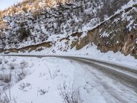 A picturesque winter dawn landscape of a road surrounded by snowy mountains, lush grass, and tall trees. The asphalt thoroughfare leads through the freezing terrain, passing by rugged rock walls and slopes. The icy geology creates a stunning view of nature's beauty embracing the break of day.