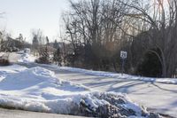 A winter day in Ontario, where a road covered in snow and frost winds through a rural landscape. The clear sky allows sunlight to illuminate the residential area, highlighting the trees and nature around it.