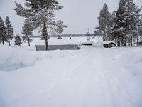 A snow-covered road in a suburban residential area of Sweden. The white snow blankets the trees and homes, creating a serene winter scene. The cold blizzard adds a touch of freezing beauty to the European landscape.