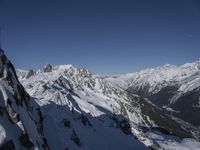 An awe-inspiring winter landscape in Chamonix, France. The snow-covered mountains of the Mont Blanc massif dominate the view. Skiers can be seen enjoying the glacial slopes. Clear skies contrast with contrails in the distance.