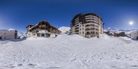 two buildings sitting at the bottom of a snow covered hillside with some buildings in front of them