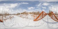 A winter landscape in Ontario, Canada, with two bridges crossing a snowy field. The house in the background adds to the picturesque scene. The orange railings of the bridges stand out against the snow-covered ground.