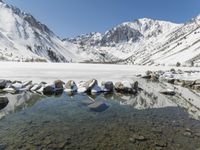 This stunning photo captures a breathtaking winter landscape. Snow-covered mountains rise majestically in the background, creating a picturesque scene. In the foreground, a tranquil lake reflects the beauty of the surroundings. The clear sky adds to the serene atmosphere. This open space is a perfect destination for nature lovers and adventure seekers. The glistening ice and snowy surface create a captivating view that will leave you in awe. Explore the wilderness and immerse yourself in the tranquility of this mountainous wonderland.
