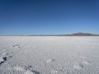 a lone snow field with a mountain in the distance and a person walking on the snow, leaving footprints