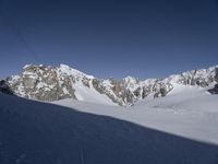 A lone skier gracefully glides through the fresh snow, surrounded by majestic mountains in the Alps. Clear blue sky provides the perfect backdrop for this breathtaking winter landscape in Italy. A popular tourist attraction for skiing and enjoying the beauty of nature.