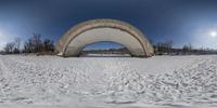 A winter park in Toronto, Canada, covered in snow. A large arched archway with a clock stands in the open space, surrounded by trees. The clear sky contrasts with the white landscape.