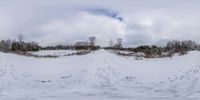 a panorama photo of snow on a road in wintertime in the countryside with trees and sky
