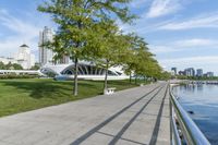 This is an image of a cityscape in Milwaukee, Wisconsin. The urban landscape features a concrete bridge over a river, with lush trees lining the shore. The residential and commercial buildings in the downtown area create a metropolitan atmosphere. Nearby, a boardwalk provides a path for pedestrians to enjoy the waterfront. The park along the riverbank offers a recreational space for residents and visitors. This photo captures the urban design and infrastructure of Milwaukee, showcasing the city's concrete streets, fixed link bridges, and nonbuilding structures. It represents a day in downtown Milwaukee, Wisconsin.