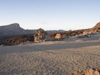 A woman riding a horse across the vast desert landscape of Tenerife, Spain. Majestic rock formations and mountain landforms create a stunning backdrop. The clear sky at dawn adds to the serene beauty of this off-road adventure.
