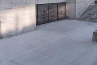 A woman is pictured skateboarding on top of a city sidewalk in Los Angeles. The vibrant cityscape of California provides the backdrop to this action shot taken during the day. In the foreground, two doors of an office building can be seen. The architecture of the building features elements of concrete, composite material, and limestone. The elevated structure creates an open space beneath, adding to the urban feel of the scene. The concrete floor and road surface add to the industrial aesthetic. Overall, this photo captures the energetic and urban essence of Los Angeles.