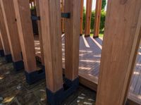 This image showcases the beautiful coastal architecture of a large wooden structure in Hong Kong. The wooden decking, accompanied by green lawn in the background, provides a picturesque view. The clear sky above casts a hard shadow on the wood floor, creating an interesting contrast. The image captures the serene coastal ambiance of Hong Kong, with its stunning coastline and proximity to the ocean. This photo is a perfect representation of a sunny day in this coastal city.