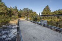 This stunning stock photo features a wooden bridge spanning across a lush forest waterfall in Canada. The clear waters spill gracefully as the bridge leads the way, surrounded by vibrant vegetation and towering trees. A picturesque dam completes the scene, creating a serene landscape. With the breathtaking fluvial landforms of streams and the mesmerizing view of the lake, this image beautifully captures the essence of nature's beauty. The bridge stands tall, ready to take you on a journey through the enchanting forests of Ontario, near the vibrant city of Toronto. The Armco barrier and the fence ensure safety as you explore this incredible natural oasis. Clouds hover above, casting soft shadows on the concrete road and guard rail. This daytime image showcases the majesty of the wooden bridge and its surroundings, inviting you to immerse yourself in the tranquility of this serene location.