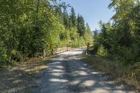 This stunning stock photo features a wooden bridge surrounded by trees in the wilderness area of Canada, specifically in British Columbia close to Lillooet. The bridge, built over a low, dirt road, perfectly blends with the natural landscape of mountains, forests, and grass. The day is clear with a beautiful blue sky, making it a perfect off-road track for nature enthusiasts. The vegetation and woody plants add a touch of serenity and shade to the scene. The road surface consists of gravel, providing a rustic charm to this picturesque land lot in the heart of Canada.