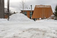 This stock photo showcases a rural scene in Canada, specifically in the city of Montreal. The image features a building with a wooden structure, adorned with a layer of snow. The weather conditions indicate that it is a snowy day with clouds in the sky. The photo captures the essence of a peaceful open space in the midst of winter. The image can be a great representation for articles or blog posts related to rural areas in Canada, winter scenes, or even for showcasing architectural design in snowy locations.