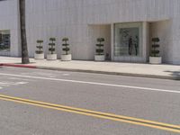 A view of a modern office building in downtown Los Angeles. The yellow lines on the asphalt road lead to the business district. The urban design features storefronts and a zebra crossing.