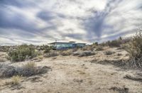 a house sits in a desert like area under a cloudy sky with sparse brush and sparse weeds