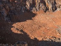 A rugged dirt road in Yunnan, China, surrounded by an elevated mountain landscape. The brown soil and gravel surface give it a Mars-like appearance. A mountain bike rider stands next to a dirt pit, adding to the adventurous nature of the scene.
