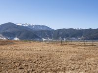 an empty field with some grass in it and mountains behind them in the distance with snow capped tops