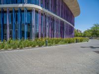 A view of the modern architecture in Zaragoza, Spain. The business district is filled with multicolored office buildings, cobblestone streets, and a clear sky above. The urban surface showcases the vibrant and dynamic atmosphere of this European city.