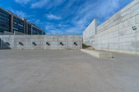 Modern architecture in Zaragoza, Spain. The city showcases a blend of urban design and open spaces. The concrete walls form a striking contrast against the clear blue skies. A perfect representation of the urban charm of Zaragoza.
